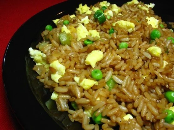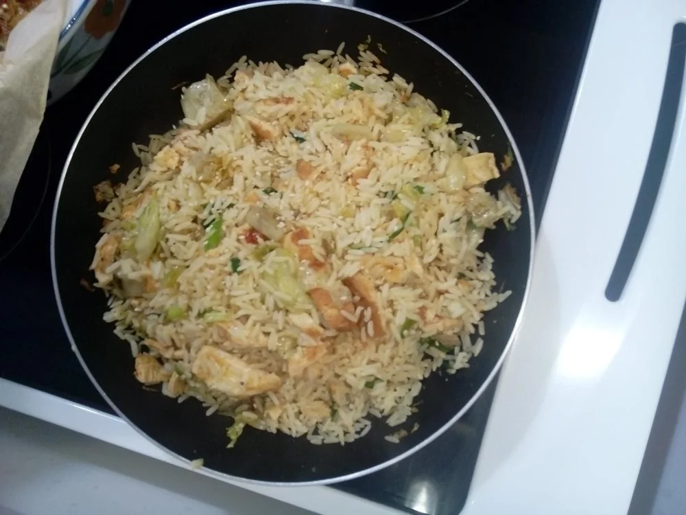 ШАГ 4 Эта ароматная смесь перемешивается с нашинкованным кочанным салатом, зеленым луком и зеленым горошком. Обжаривают овощи не больше 3 минут, в процессе добавляя соевый соус (3 столовые ложки) и отваренный рис.