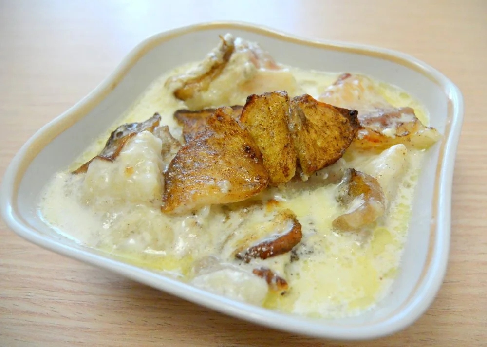 Посолите, запанируйте в муке и выложите на дно посуды для запекания.