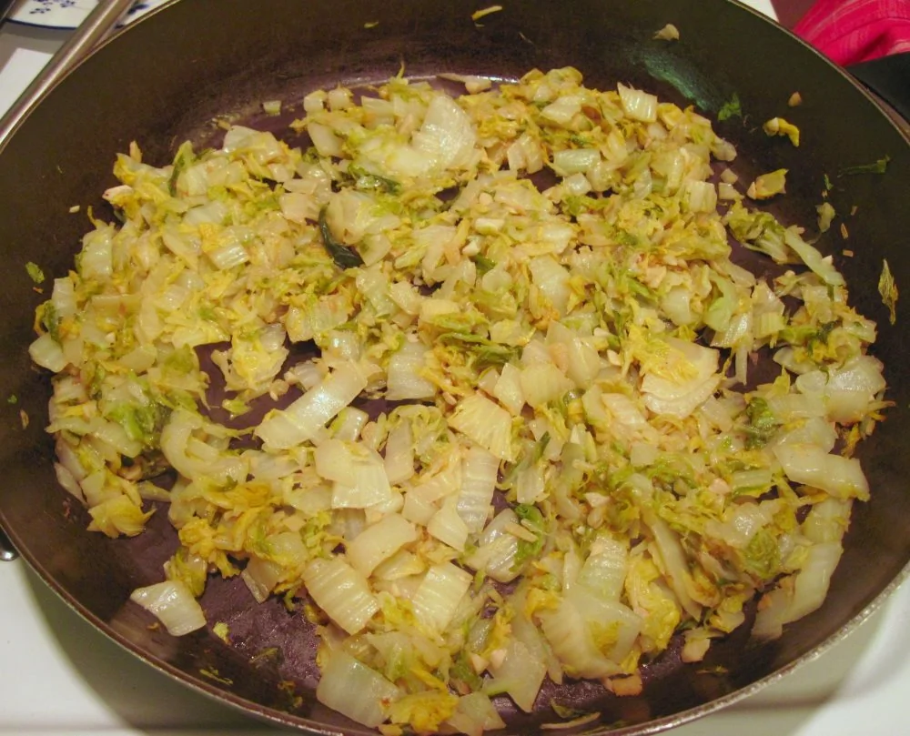 ШАГ 1 Капусту крупно порубить. Лук и чеснок мелко покрошить и обжарить на сковороде около минуты.