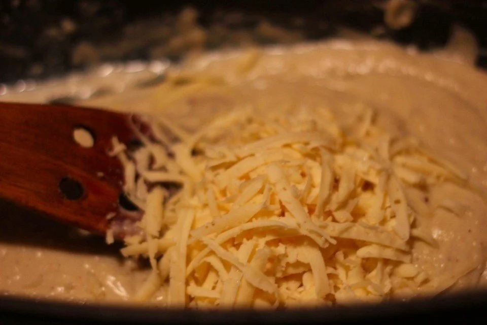 ШАГ 6 Добавьте натертый на мелкой терке сыр. Положите овощи в соус и тщательно перемешайте.