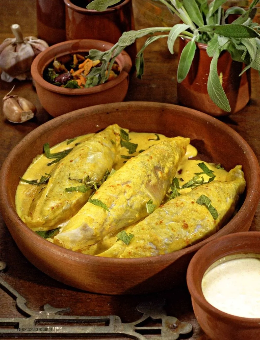 ШАГ 5 В кастрюльке разогреть оставшееся растительное масло и обжарить муку, 1 минуту. Добавить 200 мл капустного отвара, апельсиновый сок и порошок карри. Довести, помешивая, до кипения.