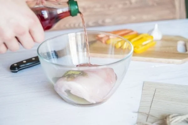ШАГ 1 Смешать все ингредиенты для маринада (оливковое масло, винный уксус, специи, чеснок и соль) и замаринуйте куриную грудку на 30-60 мин.