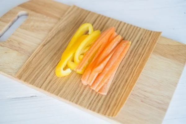 ШАГ 2 Сварите морковь до полуготовности. Нарежьте морковь и болгарский перец соломкой, а за тем выложите на лист гриль-бумаги вдоль волокон древесины.