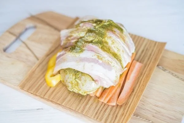 ШАГ 3 Оберните грудку 3 полосками бекона и положите её на овощи. Добавьте немного маринада сверху на бекон.