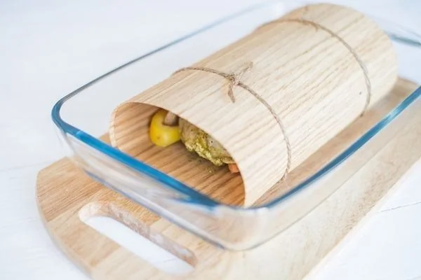 ШАГ 4 Сверните лист гриль-бумаги вокруг еды и свяжите рулон двумя влажными бечевками. Если края не сомкнулись — используйте дополнительный лист сверху. Положите рулон на предварительно нагретую сковороду или блюдо для запекания, добавьте примерно 1 см воды на дно.