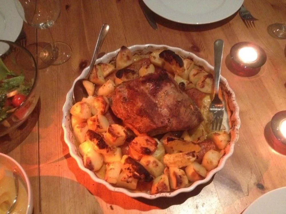 ШАГ 8 Через час достаем противень, снимаем фольгу, поливаем мясо растопленным жиром и соком, убираем шкварки на отдельную тарелку и закладываем картошку.