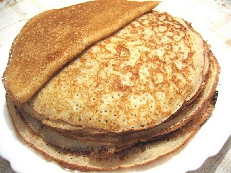 ШАГ 5 Приступаем к выпеканию блинов. Для этого нагреваем сковороду и смазываем её маслом. Набираем тесто половником, наливаем на середину сковороды и крутим её в разных направлениях, чтобы тесто равномерно распределилось по посуде. Когда одна сторона блинчика зазолотится, переворачиваем на другую сторону. Когда все блинчики будут готовы, вы можете подавать их к столу к чаю просто стопочкой со сметаной, сгущёнкой или вареньем или же начинить их чем-либо. Это могут быть как мясные и рыбные начинки, так и самые различные сладкие начинки из творога, фруктов и ягод.