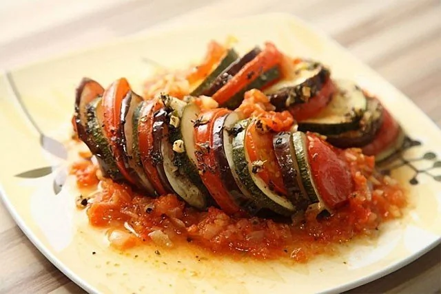 ШАГ 5 Уложить овощи, чередуя кружок помидора, кружок баклажана, кружок кабачка. Таким образом укладывать овощи, пока не будет заполнена вся форма.