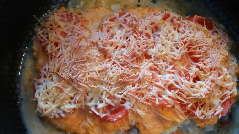 ШАГ 4 Рыбу выложить в форму (кому какая удобна). Положить лук, далее морковку в майонезе, выложить помидоры кружочками и сверху посыпать сыром.