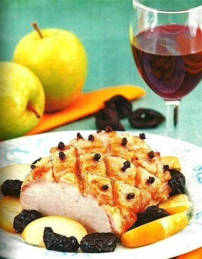ШАГ 6 Перед подачей нарезать корейку ломтиками, прогреть мясо и запечённые фрукты в приготовленном соусе.
