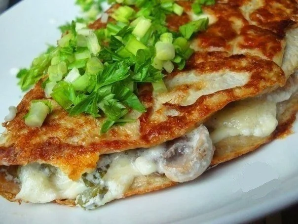 ШАГ 3 На одну половину «блина» выкладываем начинку, накрываем второй половиной, закрываем крышку и через не целую минуту выключаем. При подаче щедро посыпаем рубленным зеленым луком с петрушкой.