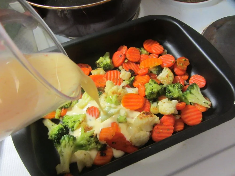ШАГ 4 Духовку разогреть до 180 градусов. В форму для запекания немного смазать маслом, положить все овощи и залить молочной смесью. Запекать примерно 45 минут. Молочная смесь должна превратиться в омлет и сыр покрыться золотистой корочкой.