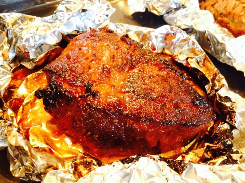ШАГ 4 Духовку разогреваем до 200 градусов. Остывшую глазурь кисточкой наносим на мясо. Ставим в духовку на 30 минут в фольге.
