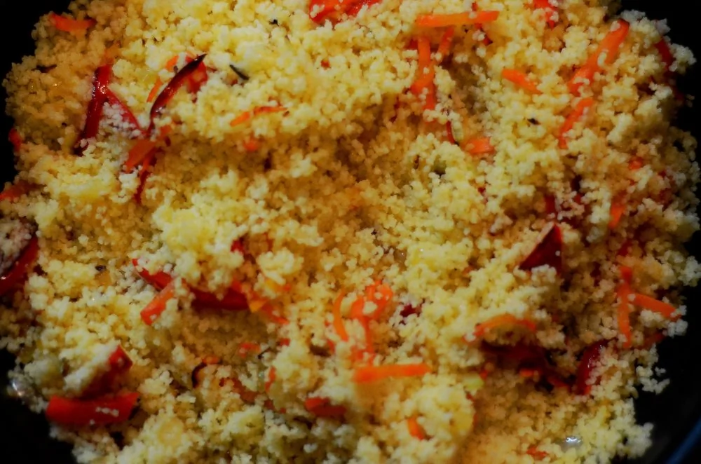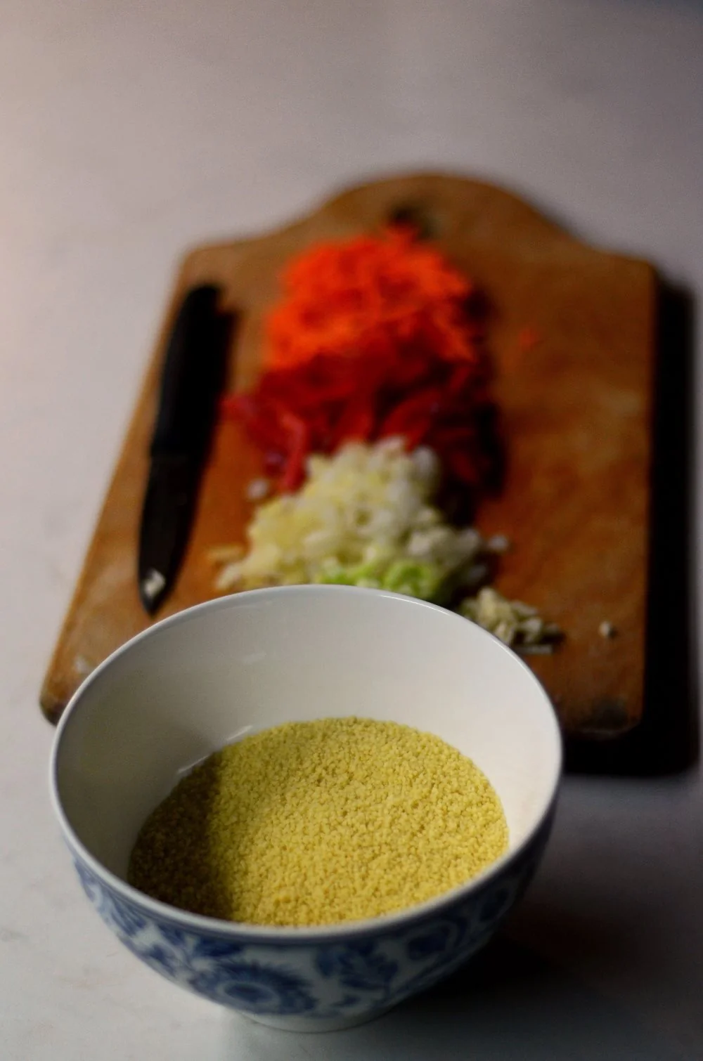 ШАГ 3 В чашке заливаем кускус кипятком, солим, размешиваем, накрываем, оставляем набухать 10 мин.