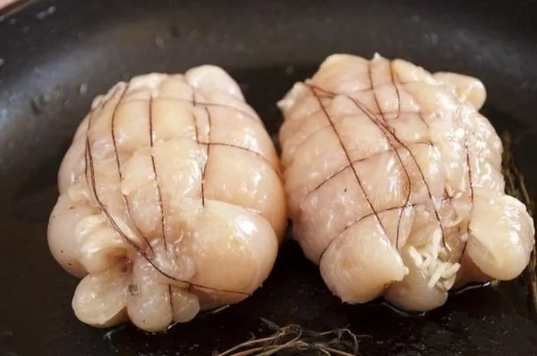 ШАГ 4 Железную форму смазать маслом, выложить рулетики, кисточкой также смазать рулетики маслом сверху. Рядом или сверху положить веточки сухого тимьяна. Запечь рулетики, поставив форму в горячую духовку (20-25 минут при 180-190 градусах).