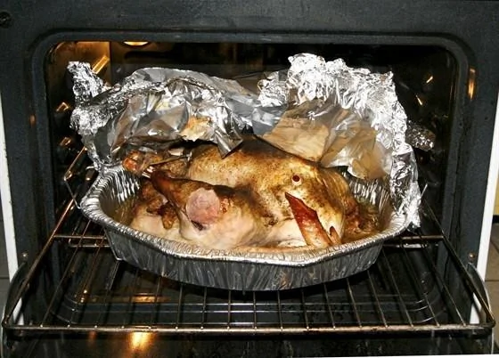 ШАГ 4 Заверните индейку в фольгу и запекайте в течение 3, 5–4 часов, до тех пор, пока температура индейки внутри не достигнет 80 градусов. За 45 минут или чуть менее до готовности блюда, снимите фольгу и дайте возможность индейке подрумяниться.