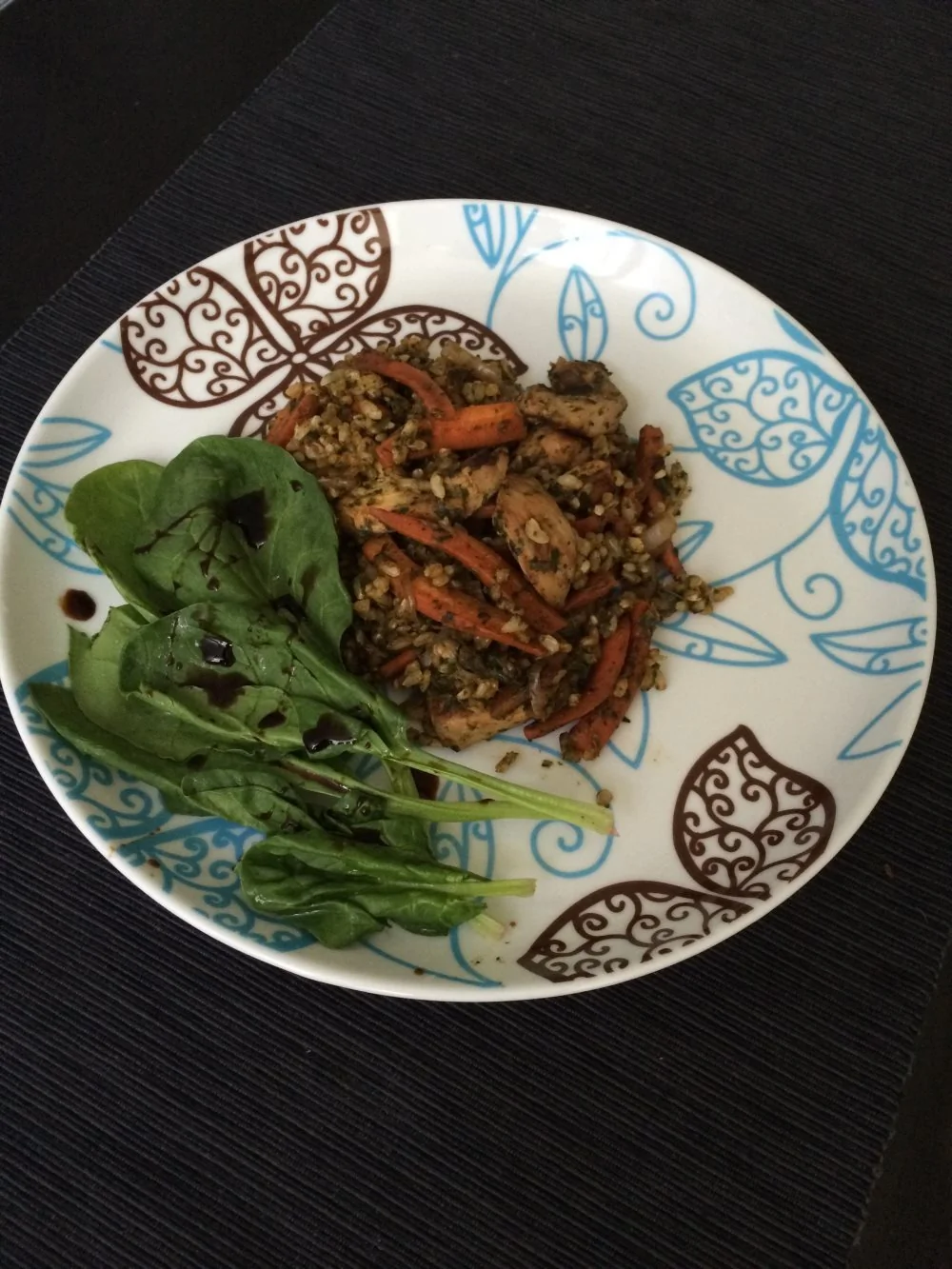 ШАГ 5 На разогретой антипригарной (я не использую масло для жарки,поэтому сковорода должна быть антипригарной)сковороде обжаривать нарезанное куриное филе 5-7 минут,добавить морковь и обжаривать на максимальном огне еще 7-10 минут,периодически помешивая,добавить шпинат и раздавленный чеснок,.Обжаривать все вместе еще минут 5 .Добавить лук т,чтобы он слегка поджарился. Посолить.Добавить заранее приготовленный (любым удобным способом) рис и несколько ложек устричного соуса или терияке. Перемешивая,обжаривать несколько минут. Выключить огонь. Добавить листья свежего шпината ,перемешать и дать постоять 5 минут,чтобы шпинат согрелся.