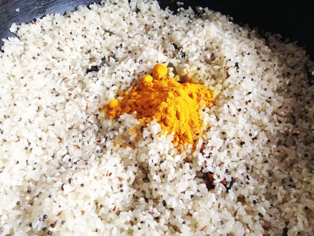 ШАГ 3 Добавляем обожаемую мной куркуму и хорошенько вмешиваем ее в наш рис.
