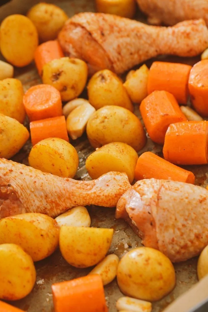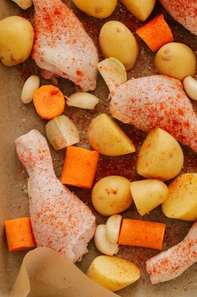 ШАГ 4 Овощи, зубчики чеснока и куриные ножки выложите на противень. Присыпьте солью, перцем и паприкой. Сбрызните оливковым маслом. Слегка разотрите и перемешайте овощи и курицу. Отправьте выпекаться на 1 час 15 минут в духовку.