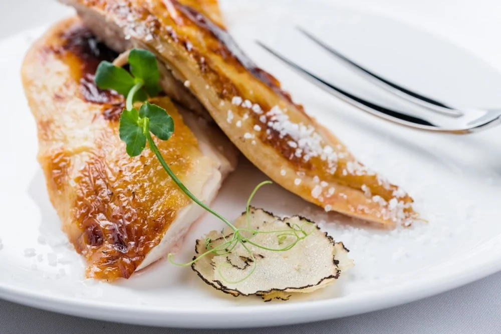 Ножка бресской пулярки, запеченная в печи, с молодыми овощами