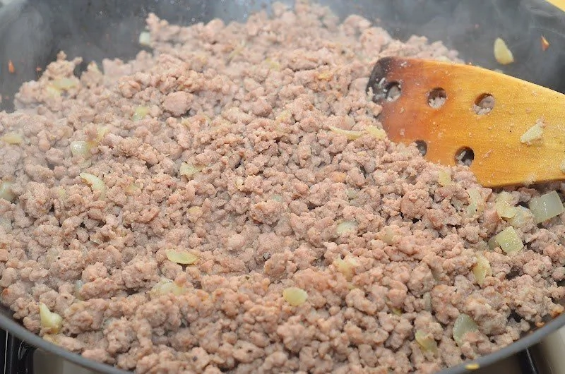 ШАГ 2 На растительном масле обжарить мелко нарезанный лук и чеснок до румяности. Добавить фарш, посолить, поперчить и жарить до готовности.