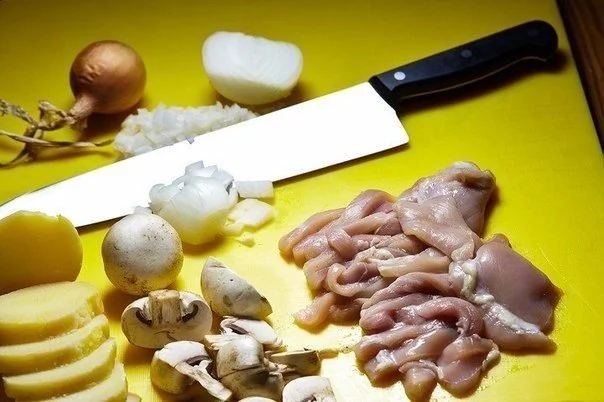 ШАГ 1 Куриные бедра тщательно промыть, обсушить полотенцем и нарезать брусочками. Шампиньоны тщательно промыть, очистить и нарезать дольками. Репчатый лук очистить и нарезать кубиками (0,5 х 0,5 см). Отварной картофель очистить и нарезать кружочками толщиной 0,5 см.