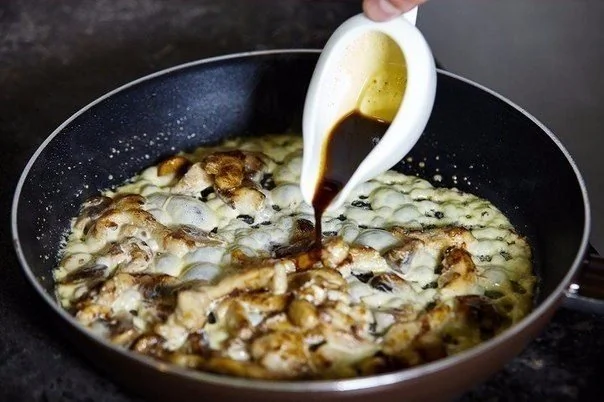 ШАГ 4 Добавить сливки и соус ворчестер. Непрерывно помешивая, прогреть до загустения. После загустения снять сковороду с огня.