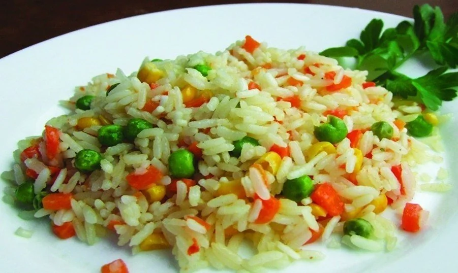 ШАГ 4 Выложить рис, креветки, кукурузу, горох, помидоры, перец в сковороду и добавить по желанию соевый соус. Обжаривать в течение трех минут.