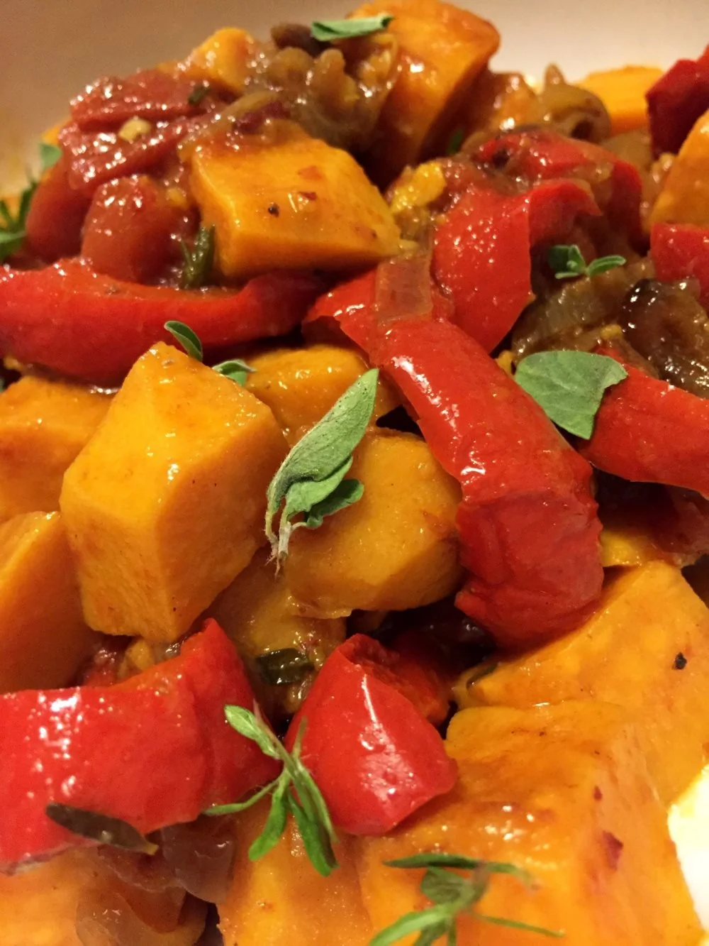 ШАГ 4 Посолить, приправить карри, свежим тимьяном и орегано, снять с огня и дать постоять 5 минут с закрытой крышкой, после чего можно употреблять