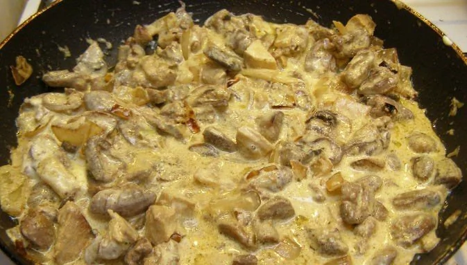 ШАГ 4 К обжаренным грибам добавить грудку, лук, измельченный чеснок, сметану и грибной бульон (можно вместо него использовать куриный).