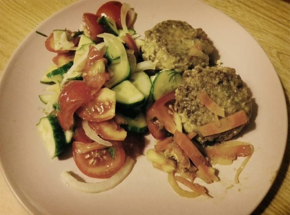 Обжарить морковь и лук в той же сковороде, где были котлеты. Добавить томатную пасту/натертые томаты, соль, перец, чеснок, немного воды и дать покипеть минуты две.