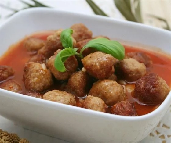 ШАГ 3 Из фарша скатать шарики размером с грецкий орех. Обвалять их в муке так, чтобы они были покрыты тонким слоем. В глубокой сковороде разогреть оливковое (или подсолнечное) масло, бросить туда фрикадельки и жарить около 5 минут, часто переворачивая, на сильном огне. Затем переложить фрикадельки в блюдо для запекания и залить соусом. Поместить блюдо в предварительно разогретую до 180 градусов духовку на 15 минут.