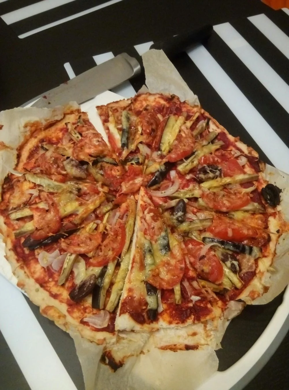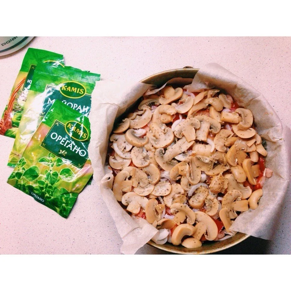 ШАГ 3 Томатной пастой мажем корж из курицы, выкладываем начинку слоями: лук нарезанный полукольцами, помидоры нарезанные полукольцами, грибы, сыр натертый на терке.