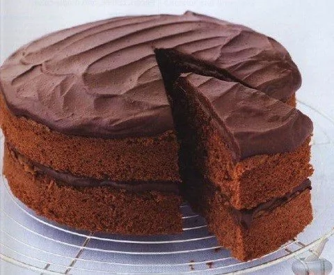 ШАГ 4 Остывший корж разрезать на 4 одинаковых квадрата, удалить бумагу для выпечки и сложить торт, смазывая коржи шоколадным кремом. Поставить торт на несколько часов в холодильник.