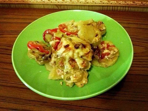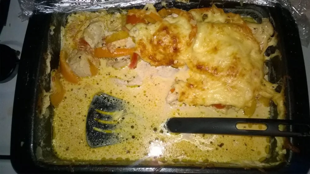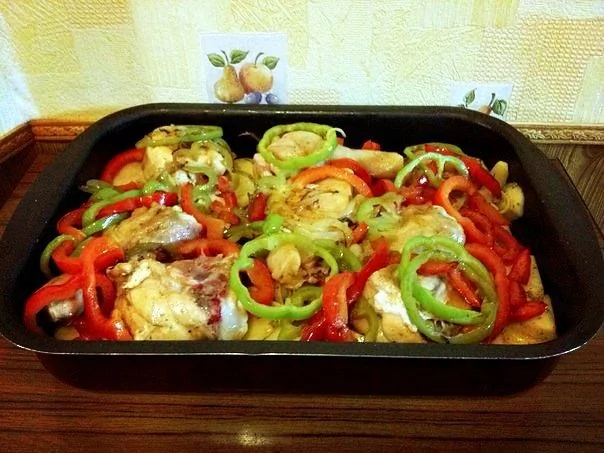 Запеченная курица в сливочном соусе с овощами и картофелем
