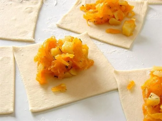 ШАГ 2 Из муки, соли и воды замесить эластичное тесто. Тонко раскатать и нарезать на квадраты 10х10 см.