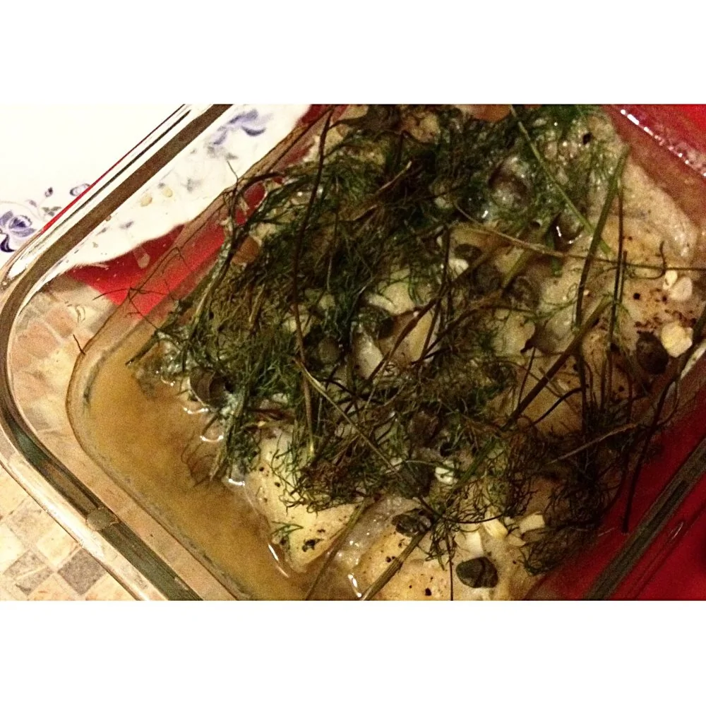 ШАГ 3 Стебли укропа также промыть, просушить и уложить сверху на рыбу.