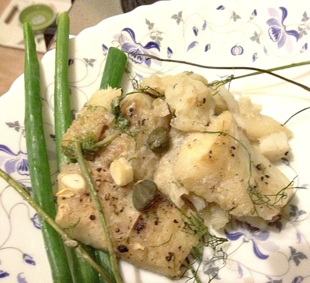 ШАГ 2 Чеснок порубить на дольки, плоды каперсов промыть в воде, чтобы смыть излишки рассола, добавить всё к рыбе присыпав сверху.