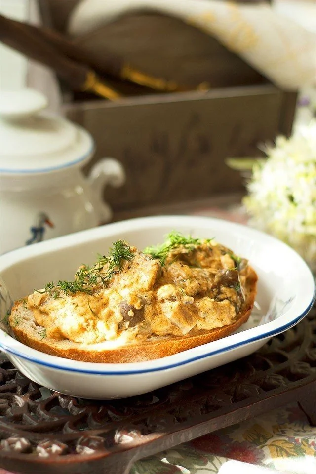 ШАГ 4 Выложить сметану с мукой к баклажанам и тушить еще десять минут. После блюдо можно выкладывать в тарелку, а можно подавать и на гренках.