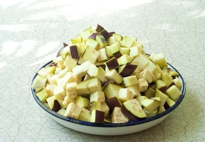 ШАГ 1 Баклажаны промыть и измельчить небольшими кубиками. Если баклажаны горькие, то их нужно вымочить в воде. Посолить кубики и оставить на тарелке.