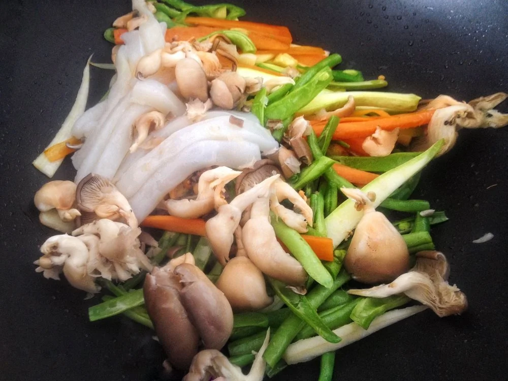 ШАГ 7 Обжариваем имбирь, чеснок, лук и острый перец 1 минуту. Затем добавляем морковь, кабачок, кусочки рапанов. Жарим две минуты. Далее бросаем лапшу, вешенки и нут. На большом огне обжариваем в течении 5ти минут. Сдвигаем все к краю вока. На освободившееся место бросаем кусочки свинины, добавив ложку меда и соевого соуса. Обжаривание должно происходить быстро, чтоб ни один из ингредиентов не начал вариться.