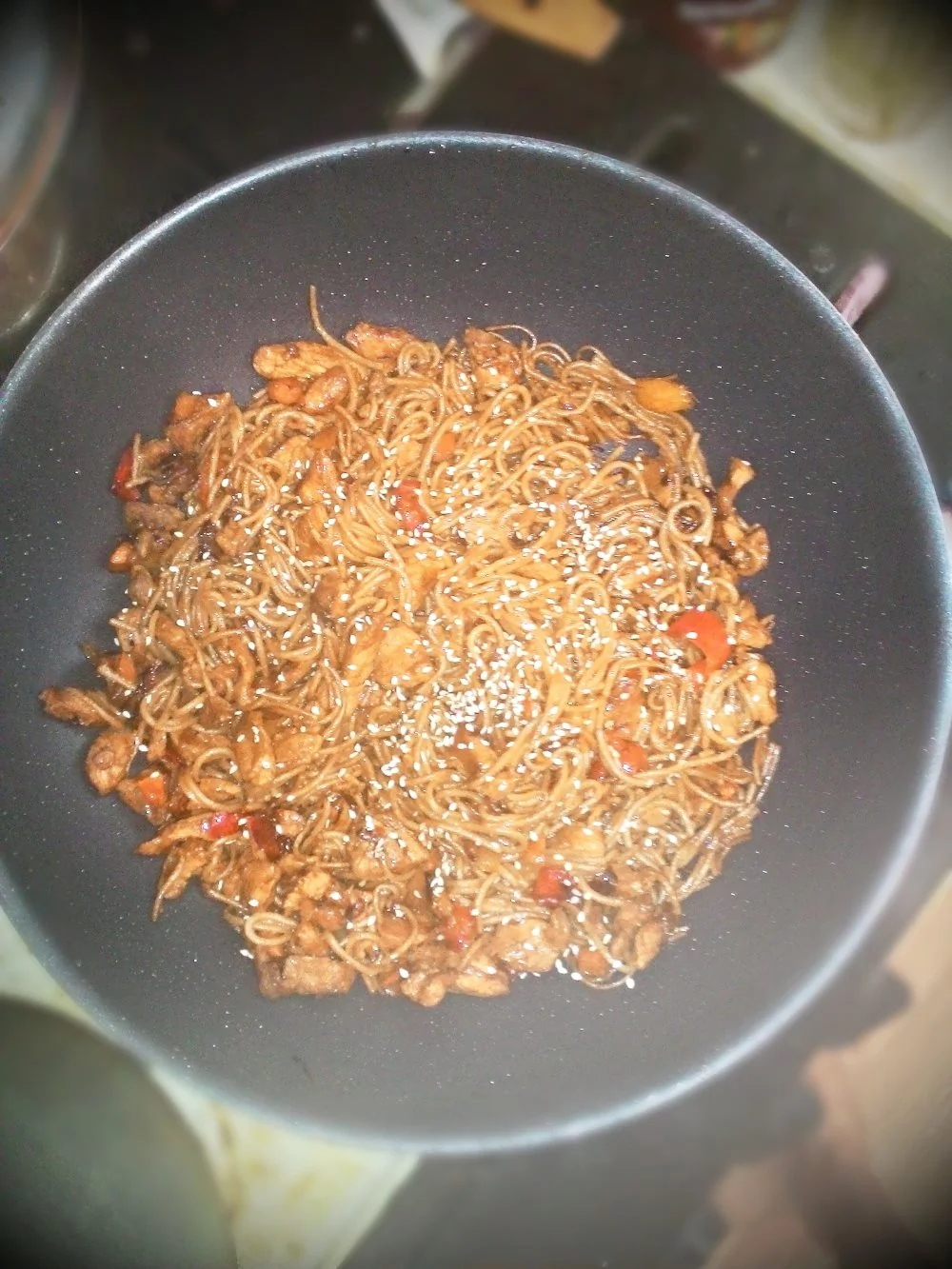 ШАГ 6 Обжаривать лапшу в растительном масле 4-5 минут до тех пор, пока лапша не станет эластичной, затем добавить соевый соус с чесноком и обжаривать около 3 минут.
