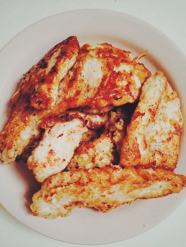 ШАГ 6 Филе обмакивать в кляр и выкладывать равномерно по несколько штук на сковороду. Пока первая партия прожаривается, можно все остальные кусочки мяса погрузить в кляр и оно пропитается.