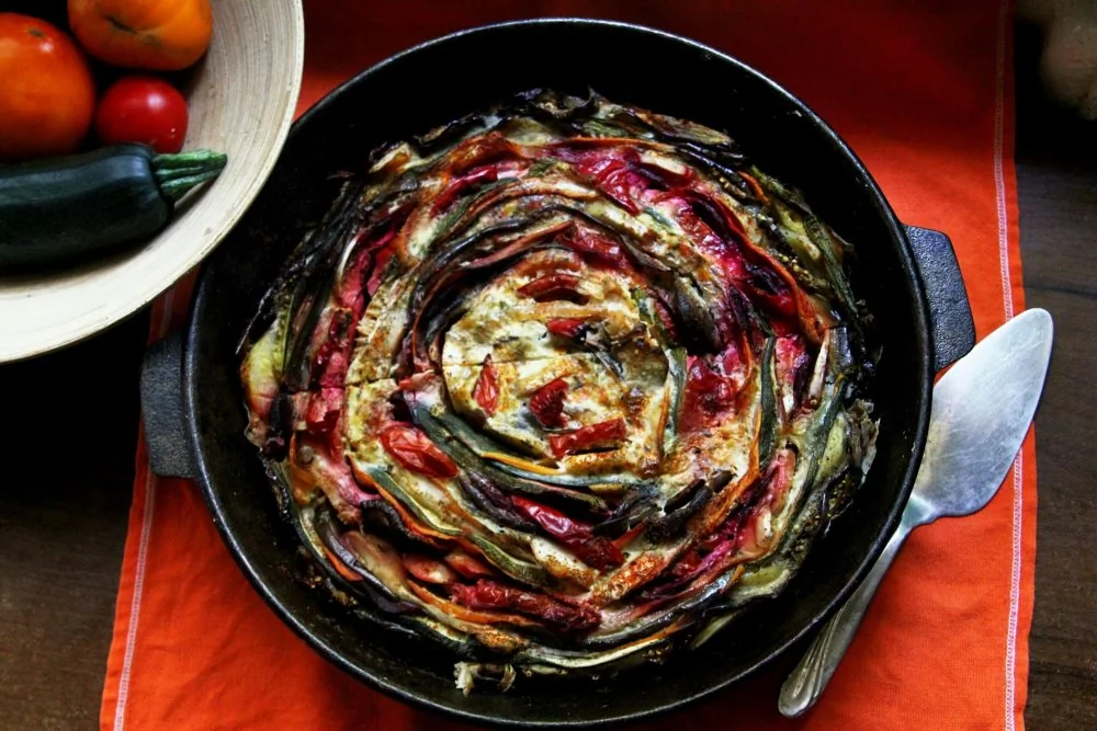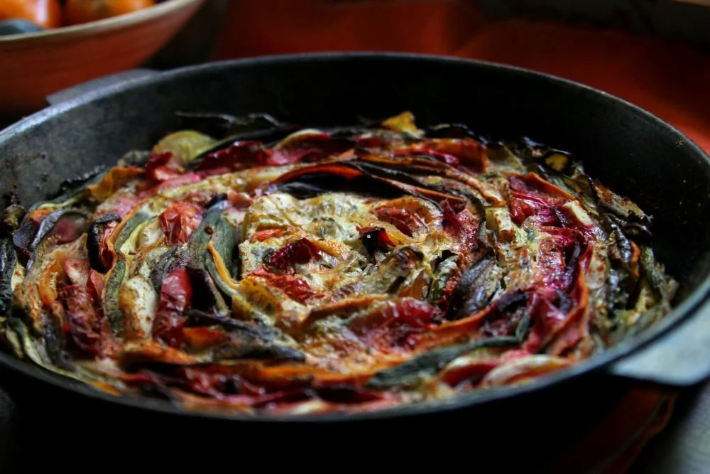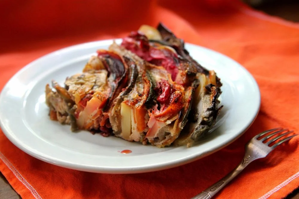 Овощная запеканка с баклажанами, сладким перцем, свеклой и помидорами