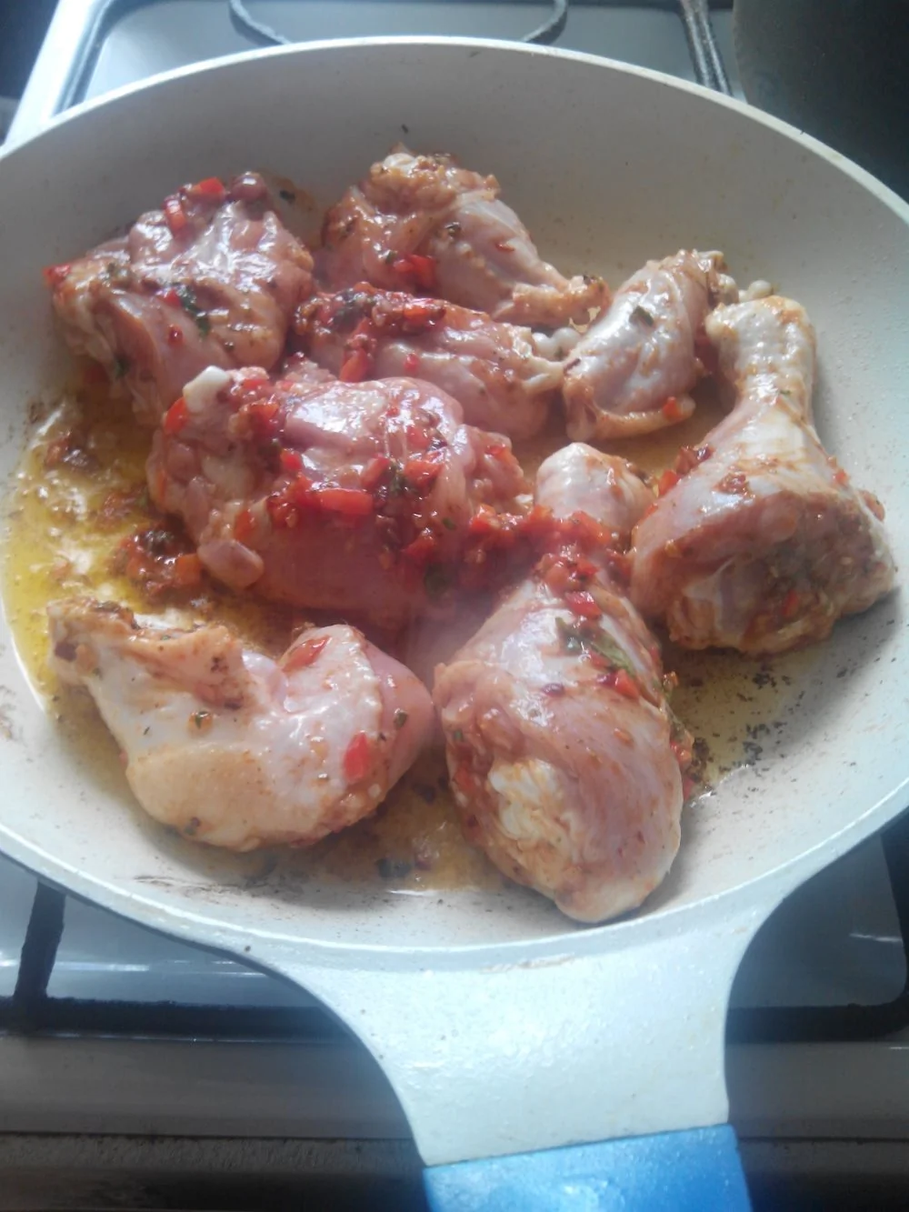 ШАГ 6 Разогреваем сковороду. Наливаем ст.л. растительного масла и выкладываем курицу вместе с овощами, в которых она мариновалась.