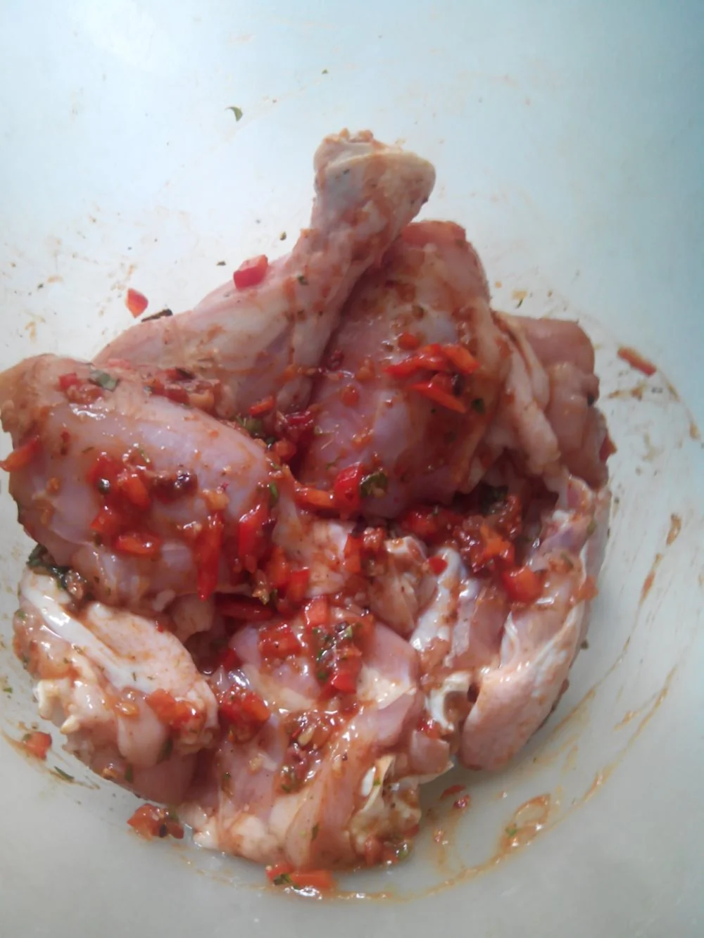 ШАГ 3 Добавляем все к курицу + немного томатной пасты + соль и перец + базилик истолочь в ступке и тоже добавить к курице. Все перемешать.