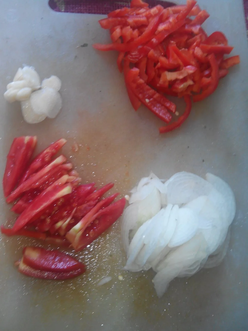ШАГ 2 Перец болгарский и лук репчатый (режем кубиком)