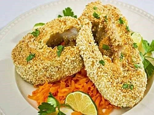 ШАГ 4 Каждый кусочек обвалять в кунжуте и обжарить до золотистой корочки в раскаленном растительном масле.