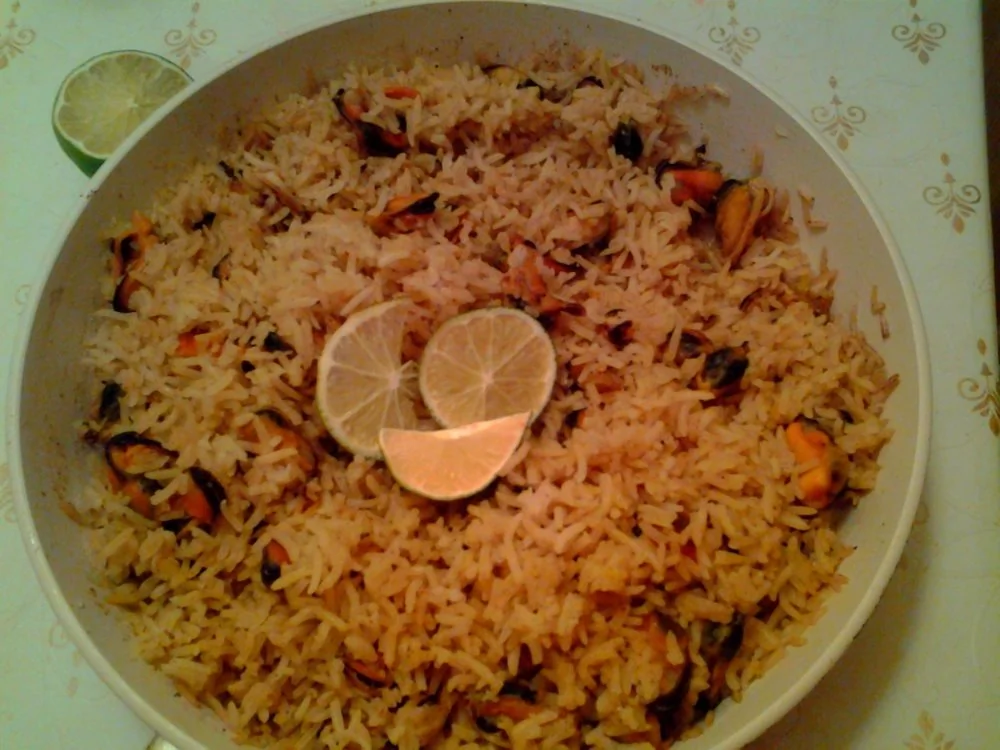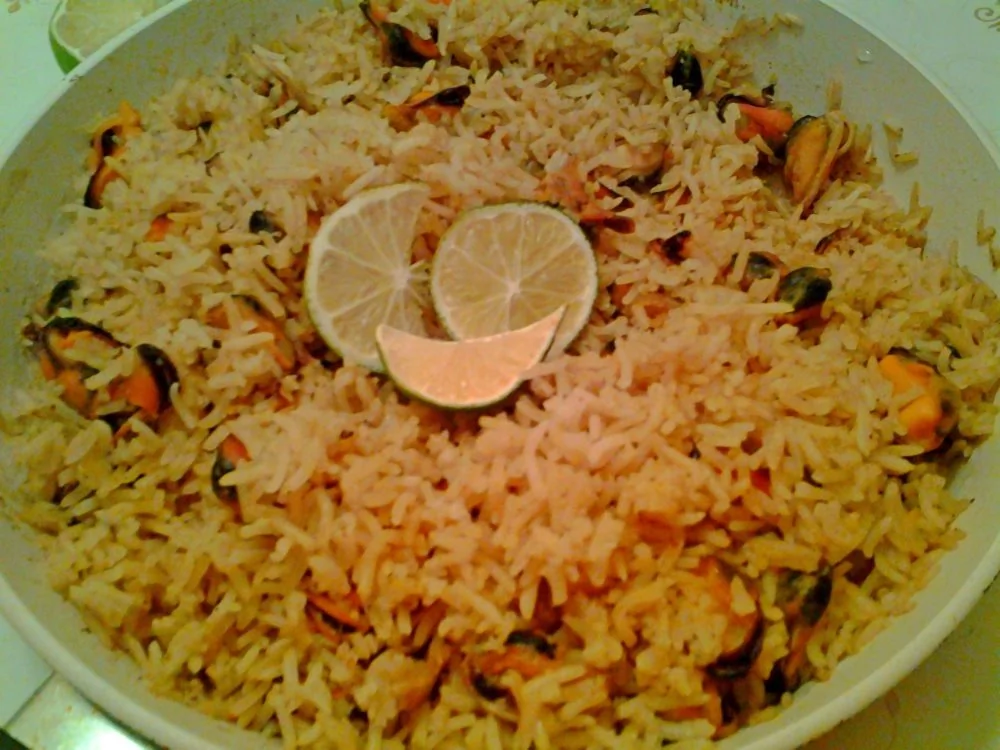 ШАГ 5 Как только рис почти впитает воду убираем лаврушку и добавляем к рису размороженные мидии и оставляем рис еще минут на 5-7.