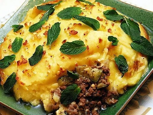 ШАГ 6 Глубокую жароупорную форму смазать сливочным маслом, выложить в нее фарш, а сверху слой пюре.